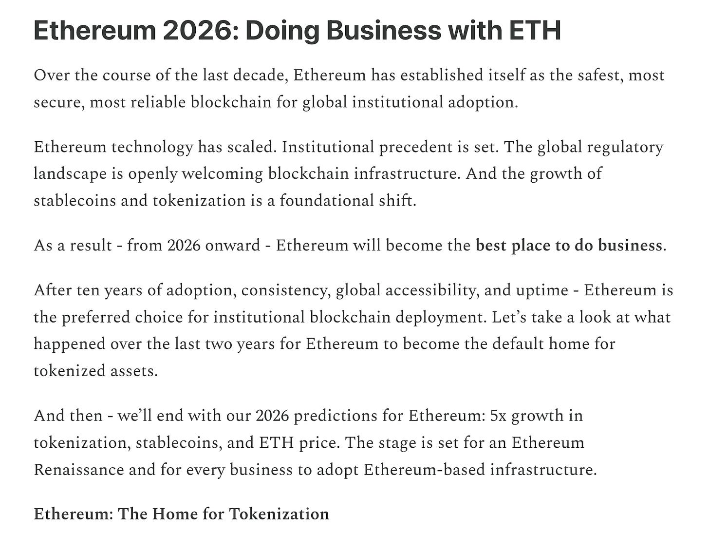 “Now, in 2026, we will see the “Internet moment” for the global financial system. And it will be on Ethereum - the best place to do business” - Etherealize via Bowtied Bull