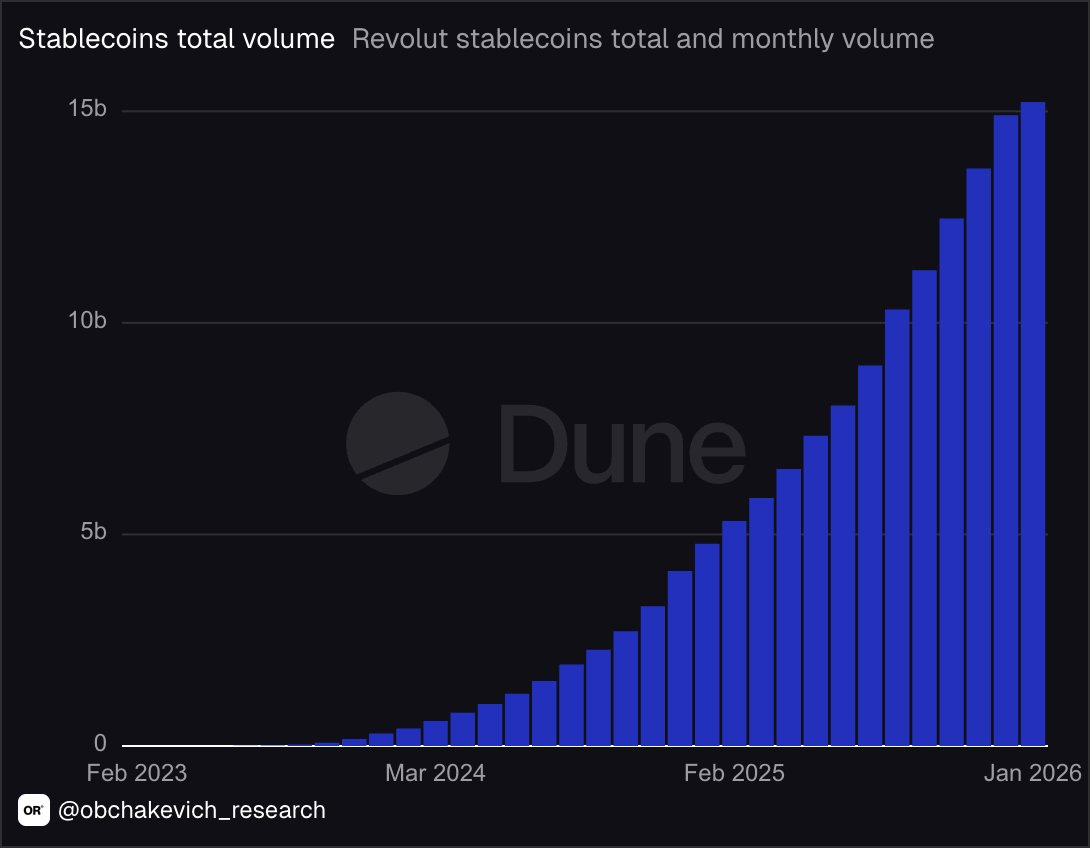 Revolut’s stablecoin transfer volume grew 87% in 2025, from $642 million in January to $1.2 billion by December. Source.