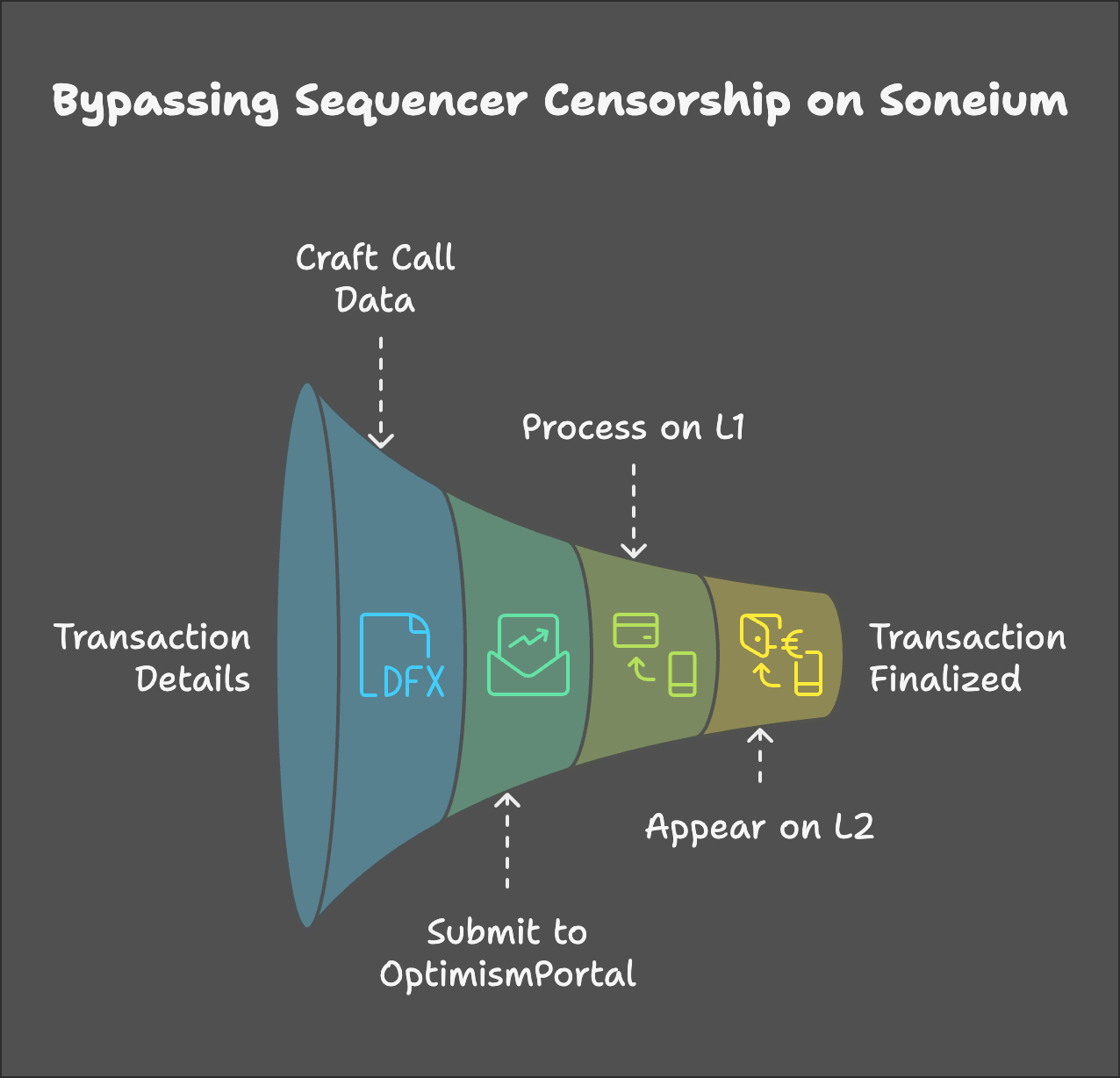 One notable aspect of Soneium, built on the Optimism (OP) stack, is its forced transaction mechanism, which allows users to bypass sequencer censorship. This feature was demonstrated by @donnoh_eth, who successfully purchased a censored token using this mechanism. Here’s how the process works: