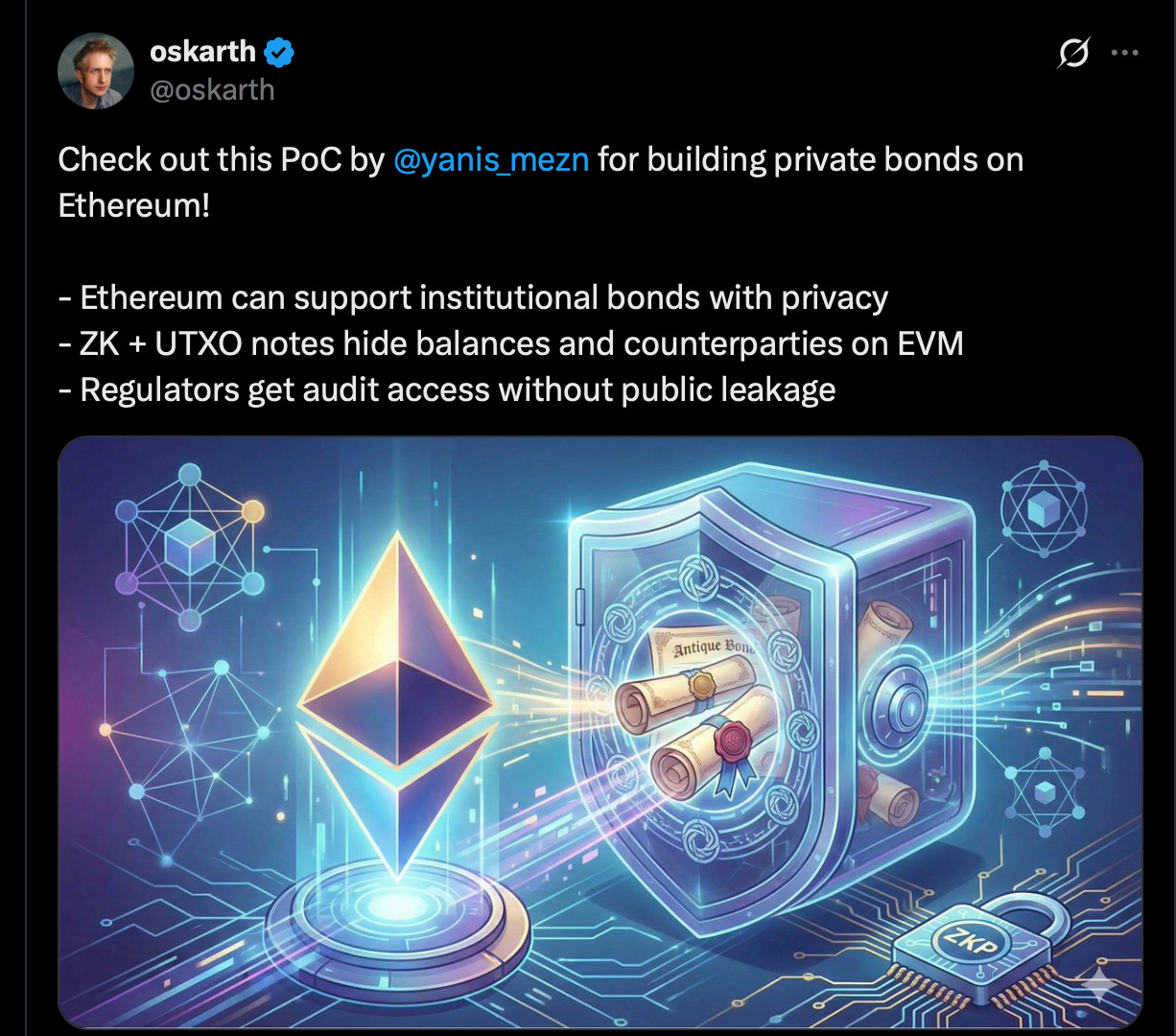 The EF’s institutional privacy team shipped a proof-of-concept for privacy-preserving bonds: ZK proofs plus UTXO notes that hide balances while giving regulators audit access. Keep an eye on their progress.