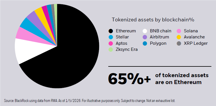 ARK projects the tokenized RWA market will hit $11 trillion by 2030, up from $19 billion today. That’s 580x growth in five years. BlackRock’s thematic report ( its 2026 thematic outlook) put a finer point on it: Ethereum underpins 65% of all tokenized assets across blockchains and “could be poised to benefit” as legacy institutions pile in.